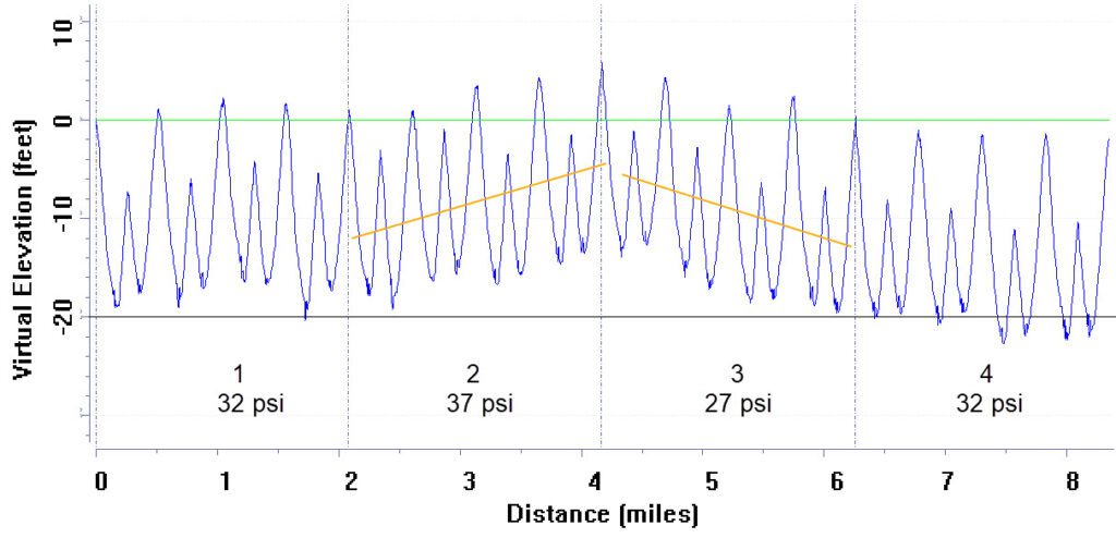 If the test is reproducible, all of the 3 BASELINE tests should be the same. The orange lines show the apparent slope trends of the BASELINE tests. The variation in the baseline slopes corresponds to about +/- 1 watt. Any conclusions are therefore subject to a +/- 1 watt error. That reproducibility is improved if the first test is discarded. That could be argued as legitimate, as I was just getting comfortable with the course and using many gear changes during that first test.