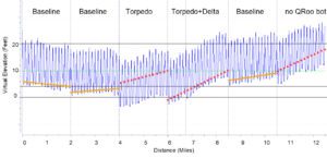 The red-dotted-line slopes are drawn for the 3 tests different from BASELINE. They are different and consistent enough to be considered significant. The data are saying that for that equipment configuration, additional power above baseline is required. That additional power is equivalent to the power needed to climb the slope of the red-dotted-line. In the case of the TORPEDO that converts to about 2 watts, for the TORPEDO + DELTA about 4 watts, and for the elimination of the QROO BOTTLE about 4 watts. All these results are +/- 1 watt accuracy.