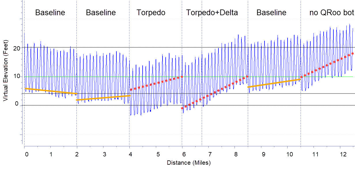 The red-dotted-line slopes are drawn for the 3 tests different from BASELINE. They are different and consistent enough to be considered significant. The data are saying that for that equipment configuration, additional power above baseline is required. That additional power is equivalent to the power needed to climb the slope of the red-dotted-line. In the case of the TORPEDO that converts to about 2 watts, for the TORPEDO + DELTA about 4 watts, and for the elimination of the QROO BOTTLE about 4 watts. All these results are +/- 1 watt accuracy.